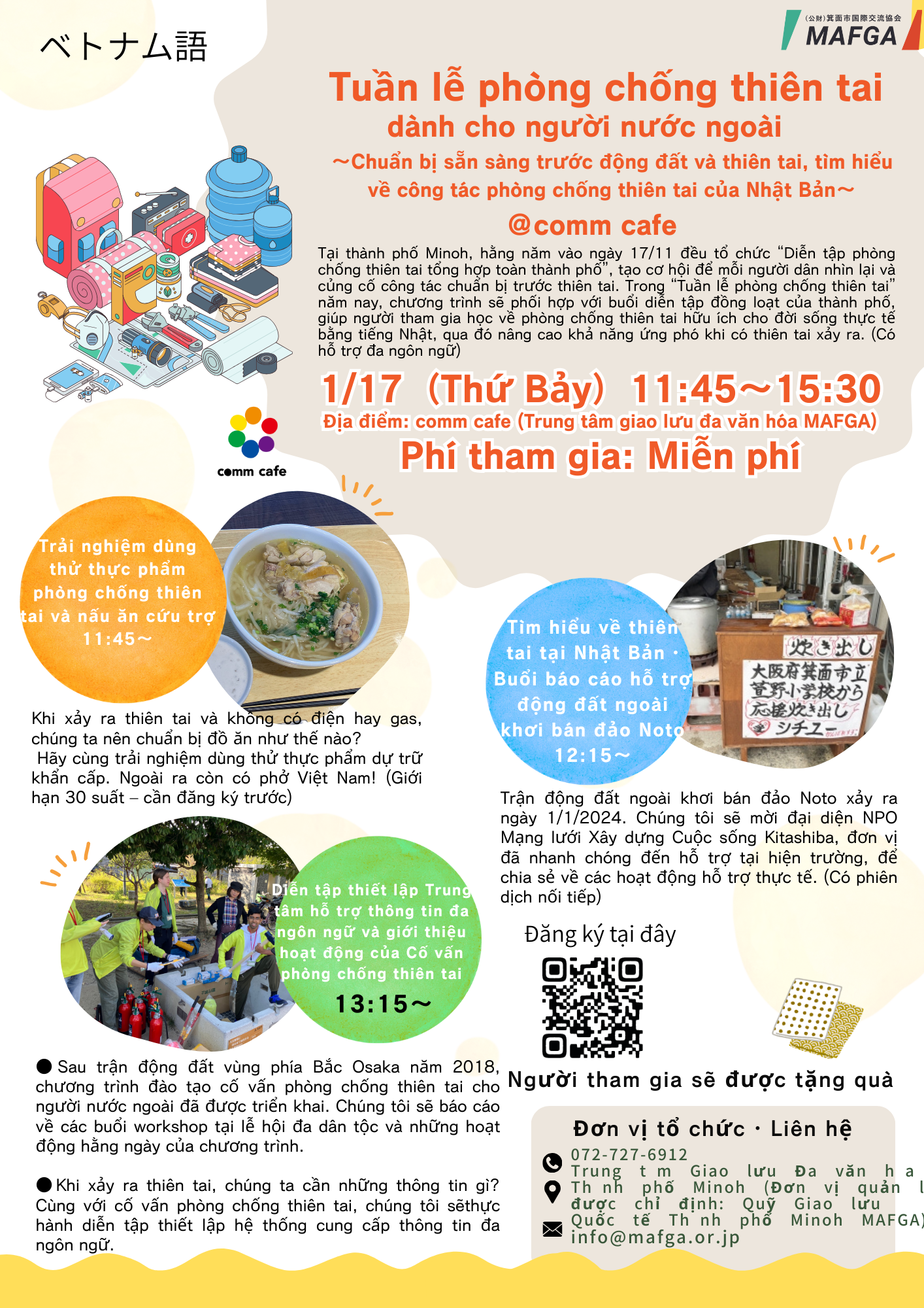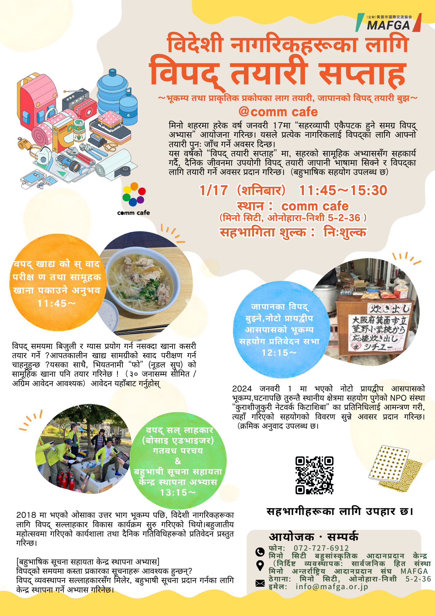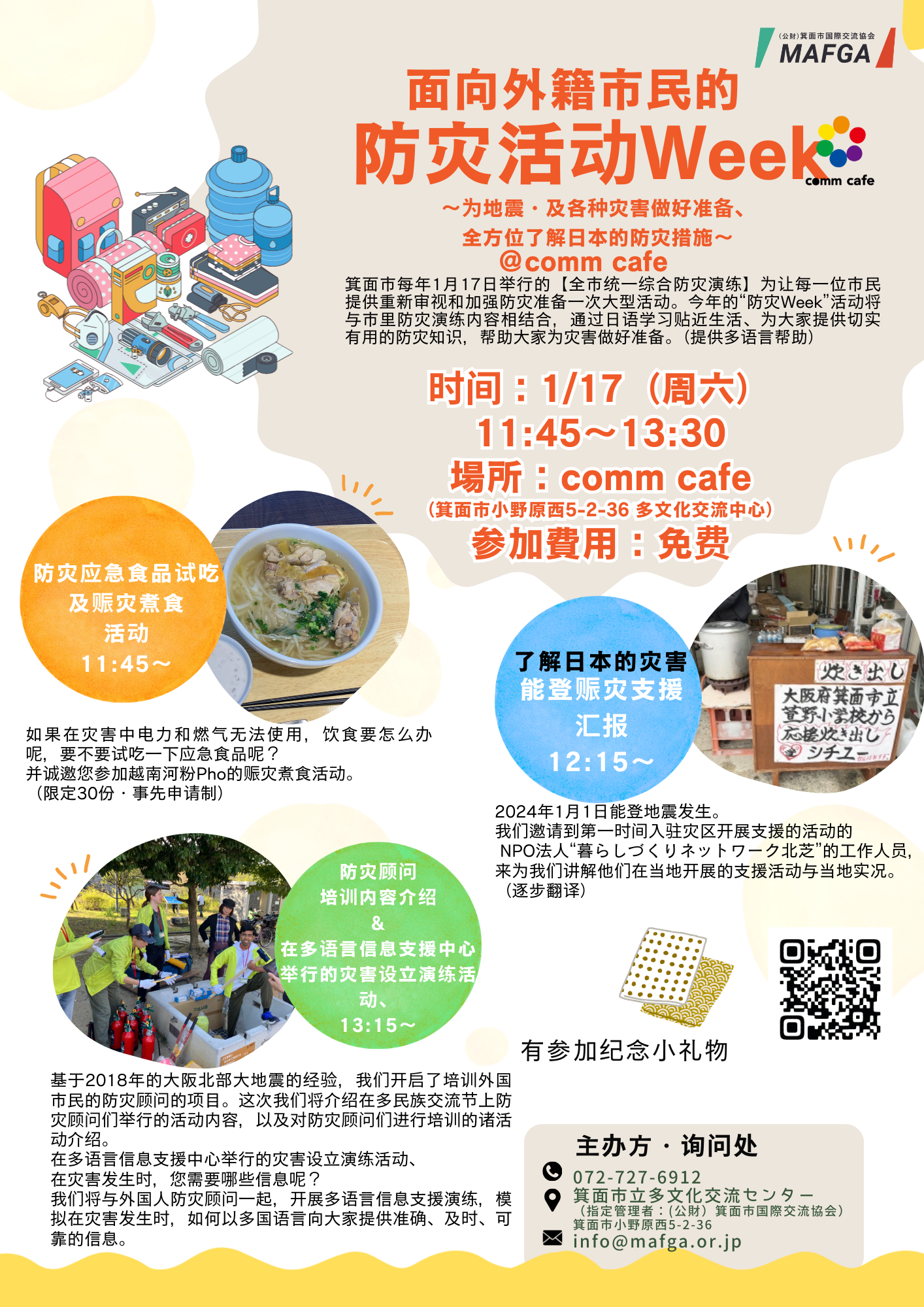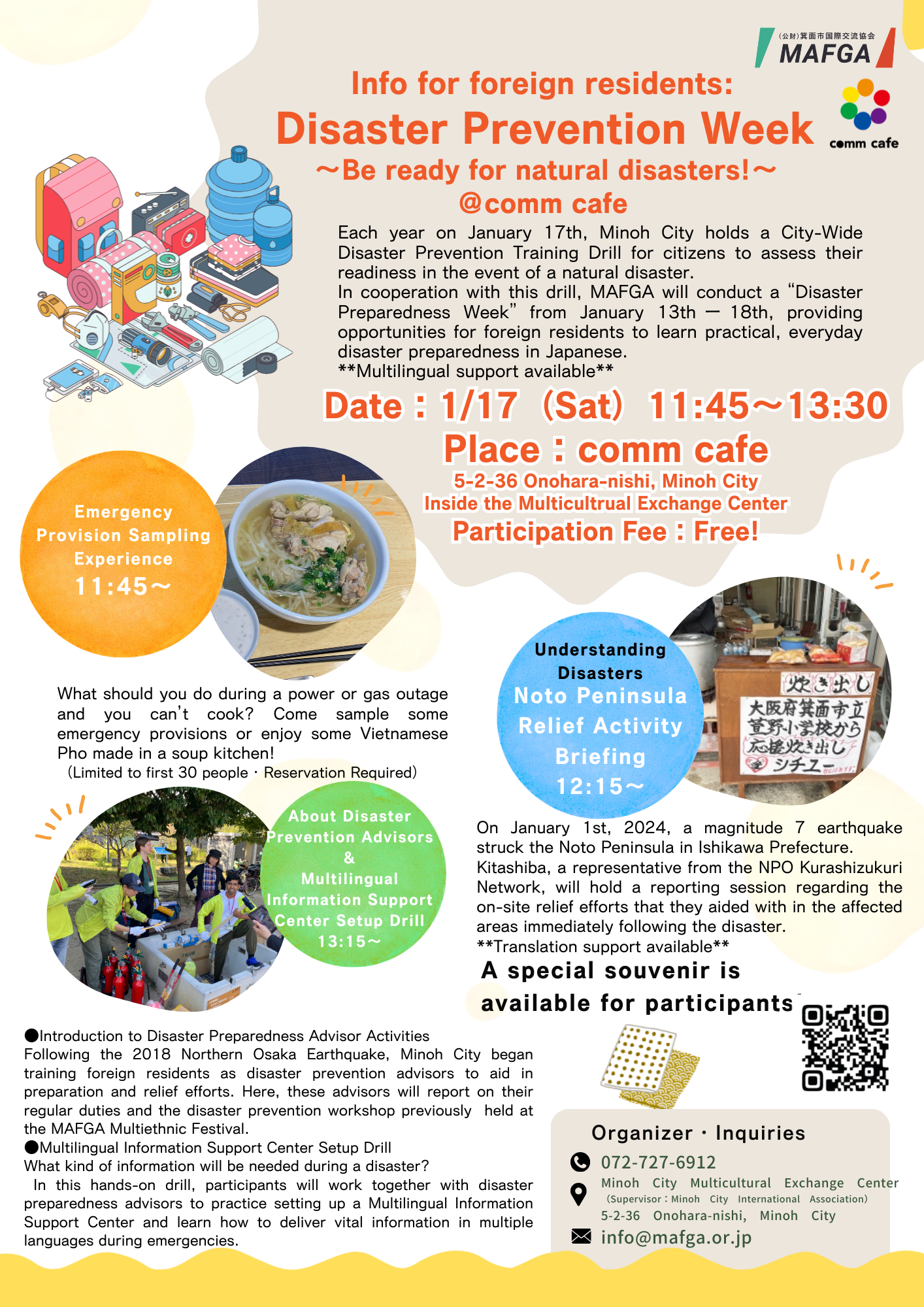 今年の「防災Week」では、市の一斉訓練と連携し、“実生活に役立つ防災”を日本語で学び、災害に備える機会をつくります。(多言語対応あり)