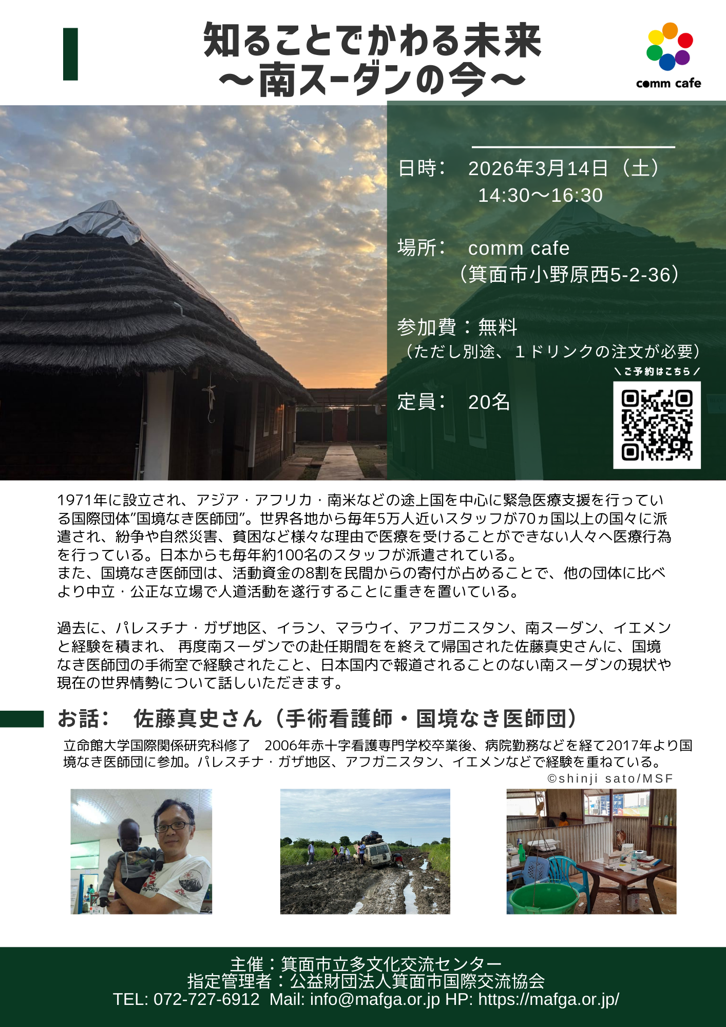 過去に、パレスチナ・ガザ地区、イラン、マラウイ、アフガニスタン、南スーダン、イエメンと経験を積まれ、 今回再度の南スーダンでの赴任期間をを終えて帰国された佐藤真史さんに、国境なき医師団の手術室で経験されたこと、日本国内で報道されることのない現地の状況や現在の世界情勢について話しいただきます。