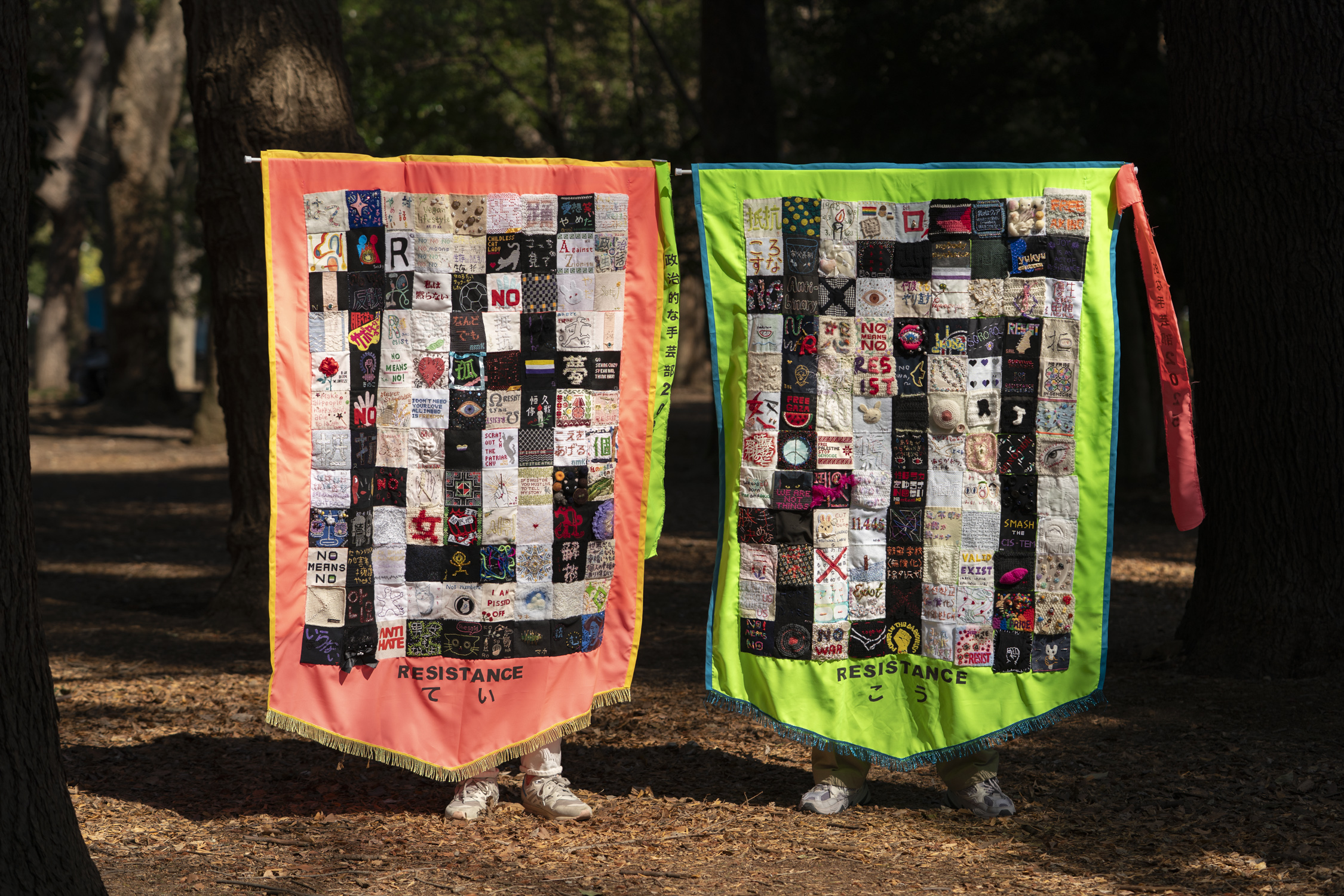 「政治的な手芸部」は、手芸という個人的で無害に見える営みを表現として用い、国際女性デーに向けてバナー(横断幕/タペストリー)作品を制作するプロジェクトです。毎回100名以上が参加し、個々が作成した10cm四方の布片を縫い合わせ、縦160cmを超える作品に仕上げています。