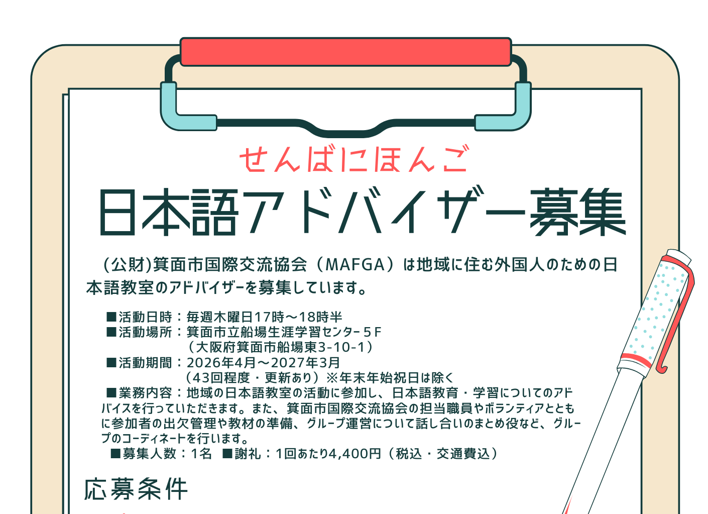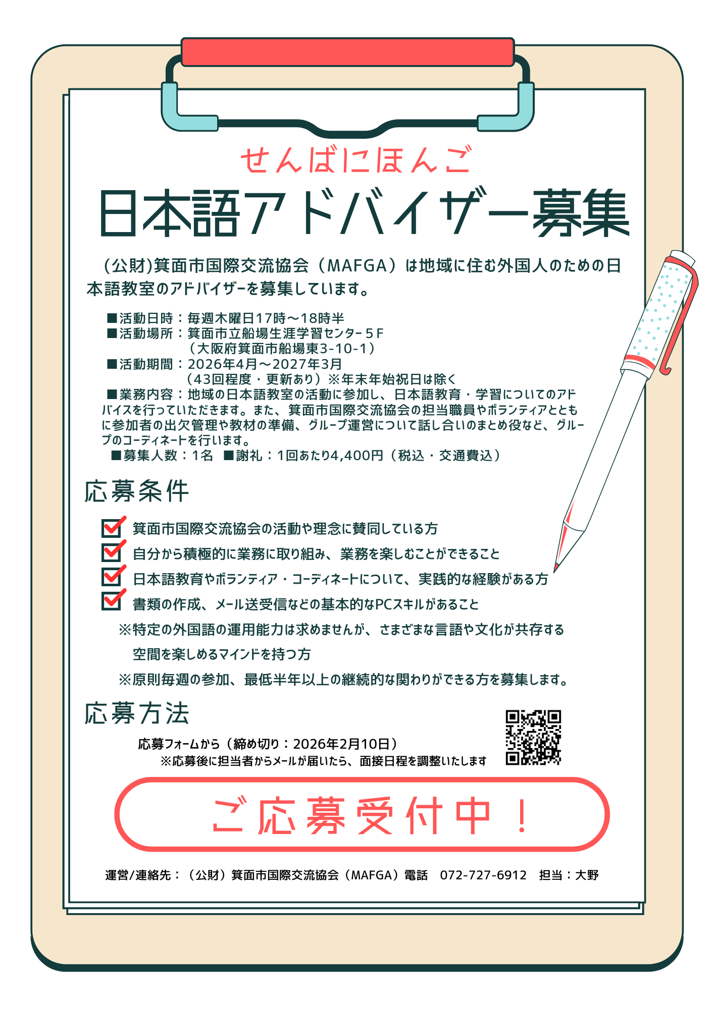 (公財)箕面市国際交流協会(MAFGA)は地域に住む外国人のための日本語教育アドバイザーを募集しています。