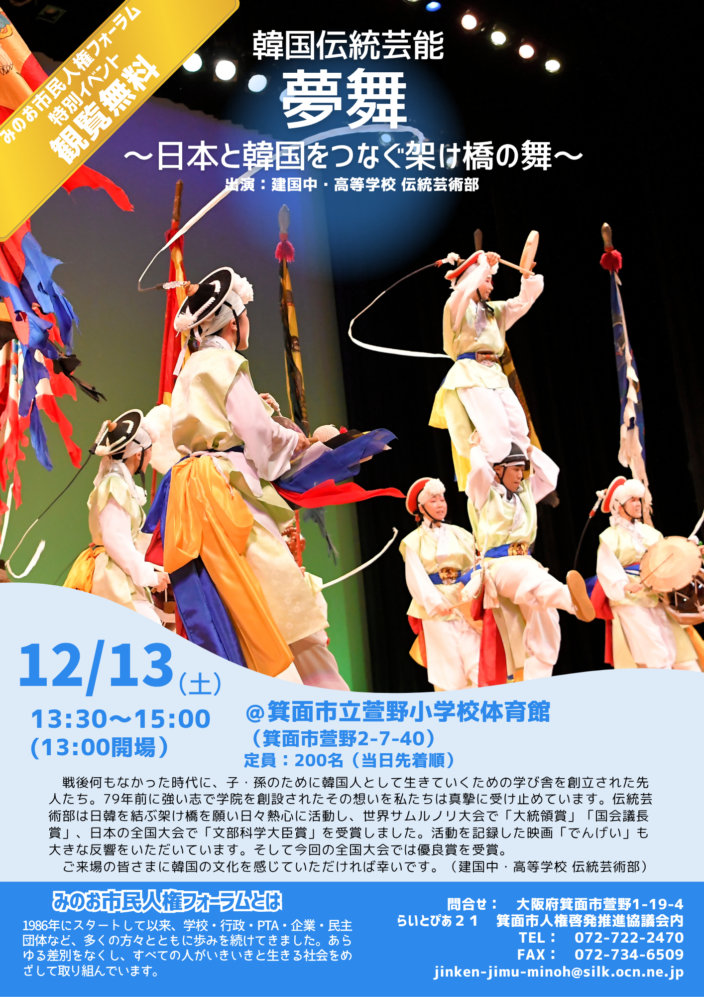 戦後何もなかった時代に、子、孫のために韓国人として生きていくための学び舎を創立された先人たち。79年前に強い志で学院を創設されたその想いを私たちは真摯に受け止めています。伝統芸術部は日韓を結ぶ架け橋を願い日々熱心に活動し、世界サムルノリ大会で「大統領賞」「国会議長賞」、日本の全国大会で「文部科学大臣賞」を受賞しました。活動を記録した映画「でんげい」も大きな反響をいただいています。そして今回の全国大会では優良賞を受賞。